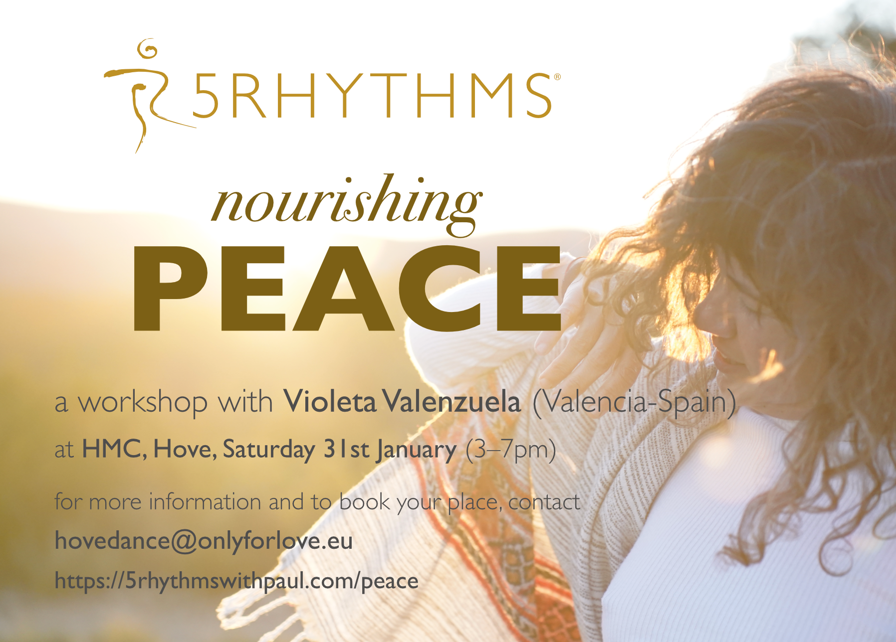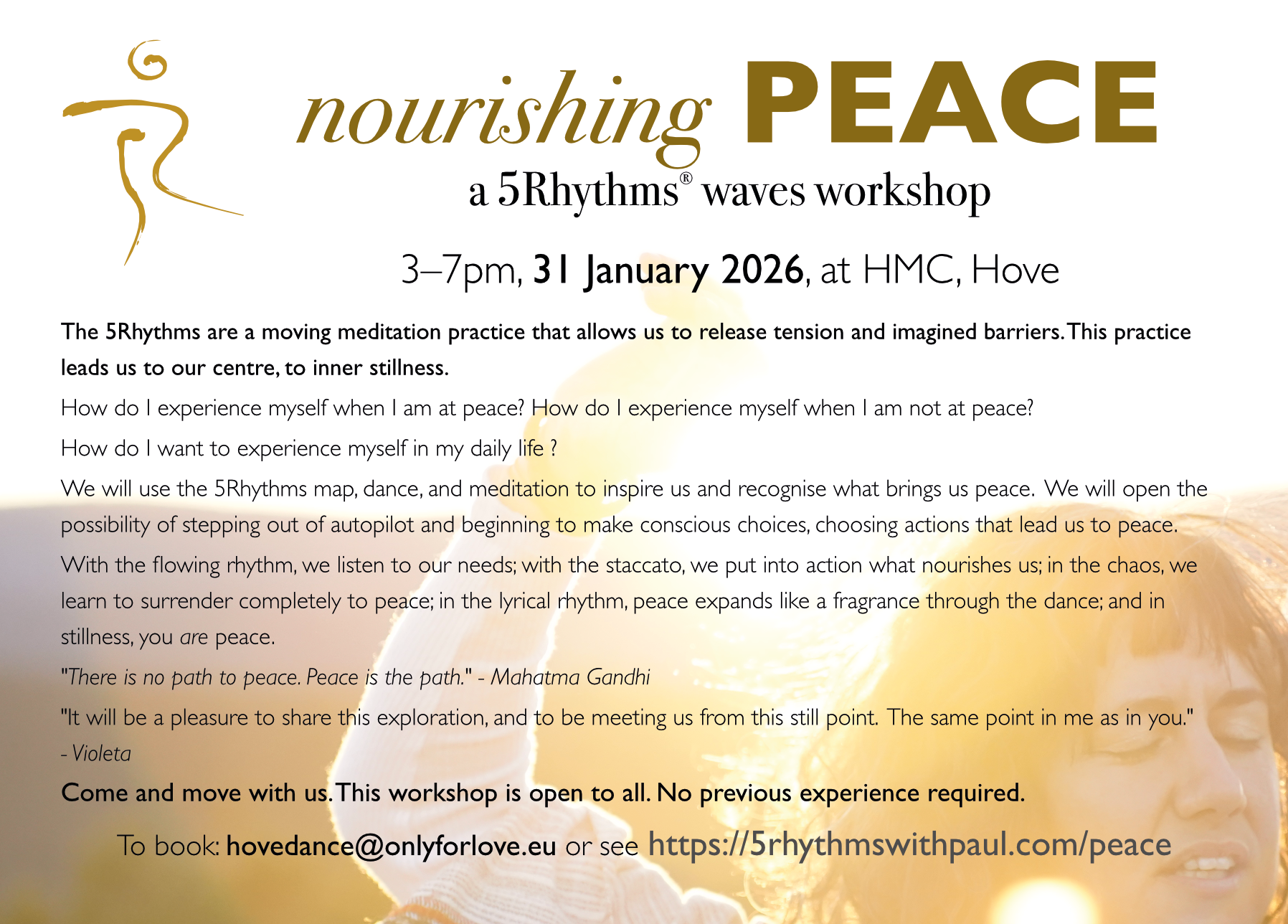 We will use the 5Rhythms map, dance, and meditation to inspire us and recognise what brings us peace. We will open the possibility of stepping out of autopilot and beginning to make conscious choices, choosing actions that lead us to it.